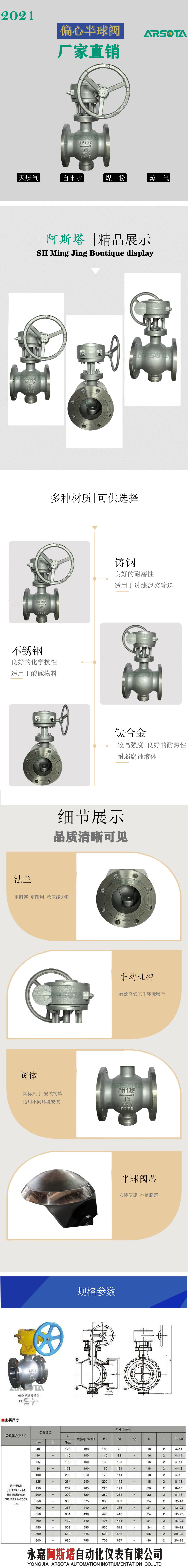 气动硬碰硬密封偏心半球阀解决了工业生产中的浆状、混流液体、灰尘等介质在管道输送中沉淀、易结垢、阻塞,使阀门关不严等问题。开关轻便,开启时球与壳体脱离,无任何接触,启动扭矩小,转动灵活。关闭时,半球与阀座的挤切作用能除去密封面上的污物,使阀门顺利启闭,密封性能好。密封面的偏心结构,使球面能自动补偿磨损,能保持阀门的密封,使用寿命长。侧装式偏心半球阀结构设计具有操作轻便、开启过程无磨擦、零泄漏、寿命长等优点。在石油、化工、冶金、电力、燃气等行业是闸阀、截止阀、Y型阀、球阀的更新换代产品。目前已畅销在钢铁行业的煤粉喷吹,氧化铝行业的矿浆、母液和氧化铝粉输送,电力行业的水力(或干)除灰,石化行业,燃气行业等场合。传动方式有手动、气动、电动三种,八个压力等级(PN0.25~10.0Mpa)数百个规格(40~1000)的半球阀